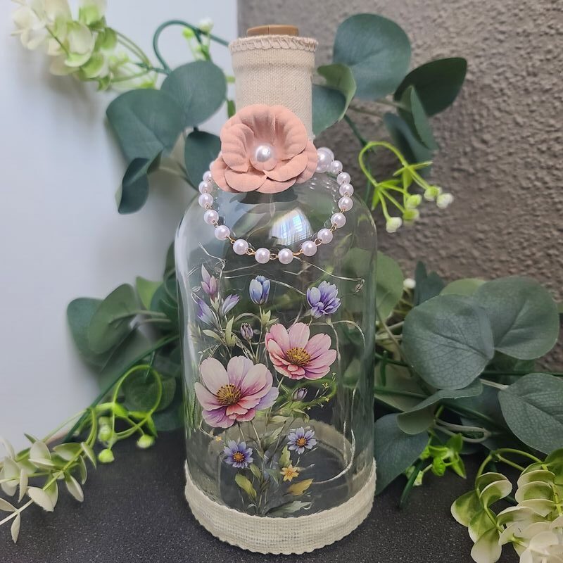 Add a touch of vintage elegance and warm ambiance to your home with this unique, hand-decorated upcycled wine bottle lamp. This one-of-a-kind piece features a delicate meadow-style floral design in soft pinks and purples, perfectly complemented by a handcrafted fabric flower and a shimmering pearl-bead necklace draped around the neck.