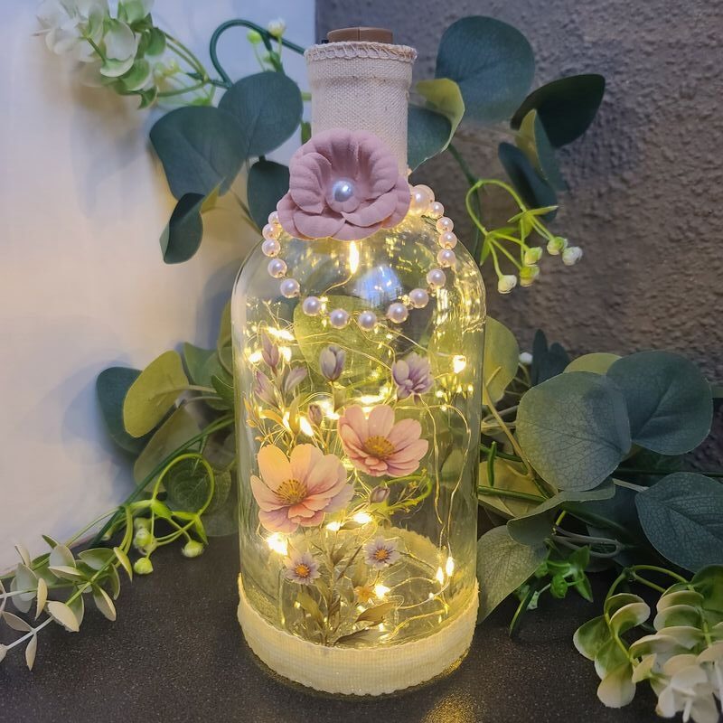 The bottle is filled with high-quality, battery-operated LED fairy lights that emit a soft, cozy glow—ideal for use as a bedside nightlight, a romantic table centerpiece, or a charming shelf accent.