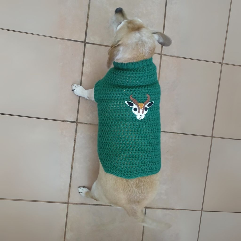 Dress your pup in comfort, warmth, and a touch of national pride with our handmade Springbok crochet dog jersey. It features a beautifully stitched Springbok head design on the green when know. This adorable jersey is perfect for showing off your dog’s personality while keeping them snug during colder days and matching your support.
